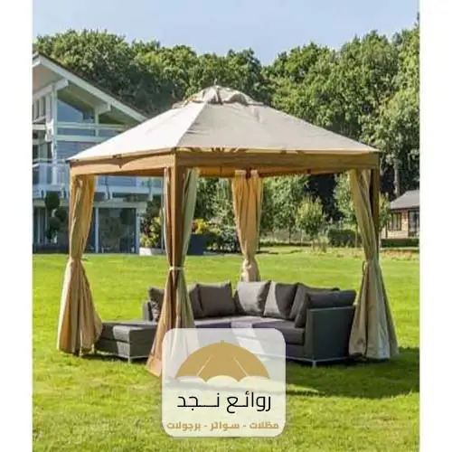 تتمتع المظلة الخشبية بجاذبية كلاسيكية وخالدة. إن مظهرها الطبيعي والمتطور مفيد في البيئات الخضراء حيث تكون الطبيعة في المقدمة. تضيف مظلات جلسات بالرياض التي يتم صيانتها جيداً جواً لطيفاً عند استخدامها في الأثاث المغطى بالخشب. الخشب الأكثر استخداماً لهذه المظلات هي خشب الساج والأوكالبتوس والخيزران. ومع ذلك، فإن هذه المواد الخام والصيانة عالية التكلفة تجعل مظلات جلسه بالرياض باهظة الثمن.